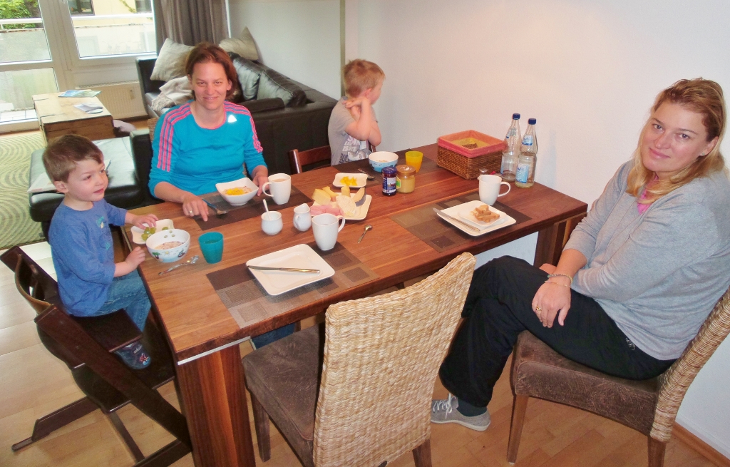 Angekommen in Frankfurt – erste Station im Hause „Schönauer“. Beim Frühstück mit Inken, Raphael und Constantin (Felix musste zur Arbeit)
